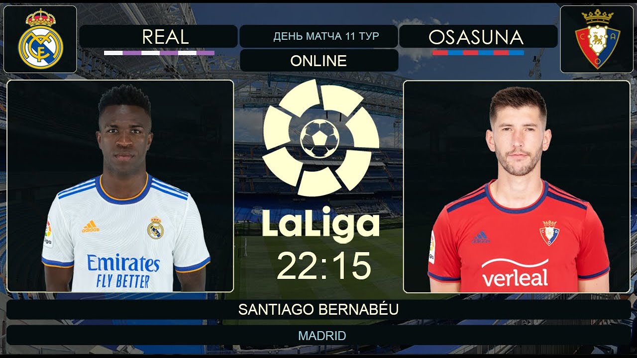 15 hours agoВ 11-м туре испанской Ла Лиги Реал Мадрид на Сантьяго Бернабеу будет принимать Осасуну. Прямая трансляция онлайн Реал Осасуна начнется в 22-30 мск. Реал Мадрид Осасуна где СМОТРЕТЬ ОНЛАЙН БЕСПЛАТНО 27 ОКТЯБРЯ 2021 ПРЯМАЯ ТРАНСЛЯЦИЯ в 2230 МСК. Матч Реал Мадрид Осасуна в рамках 11 тура Ла Лиги состоится 27 октября в 2230 по МСК на стадионе Сантьяго Бернабеу.